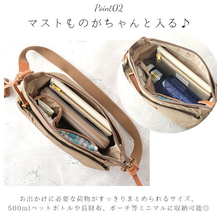 ・コンパクトな見た目ながら、お出かけに必要な荷物がすっきりまとめられるサイズ。500mlペットボトルや長財布、厚めのポーチ等ミニマルに収納可能◎