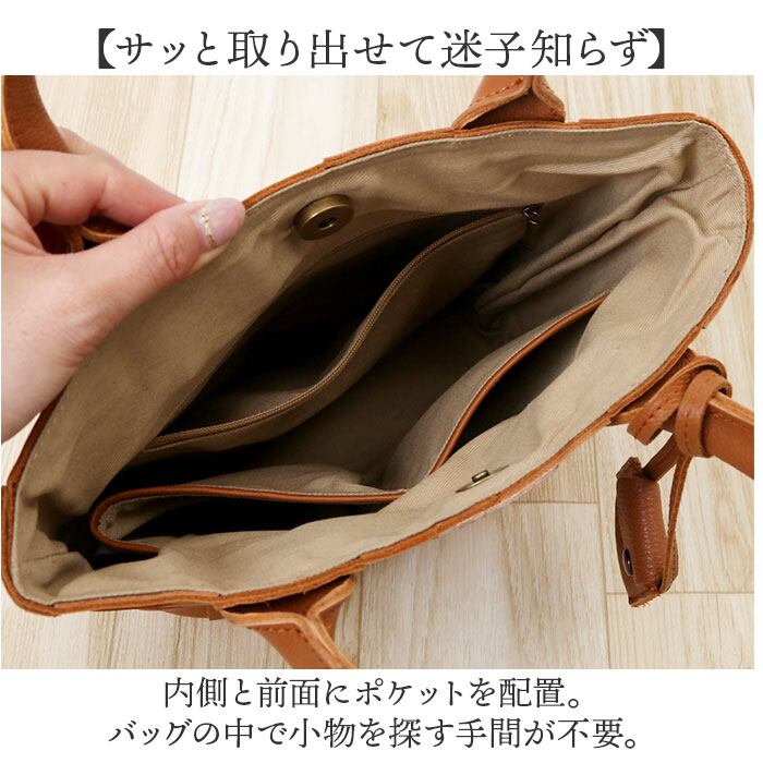 ・内側と前面にポケットを配置。バッグの中で小物を探す手間が不要。