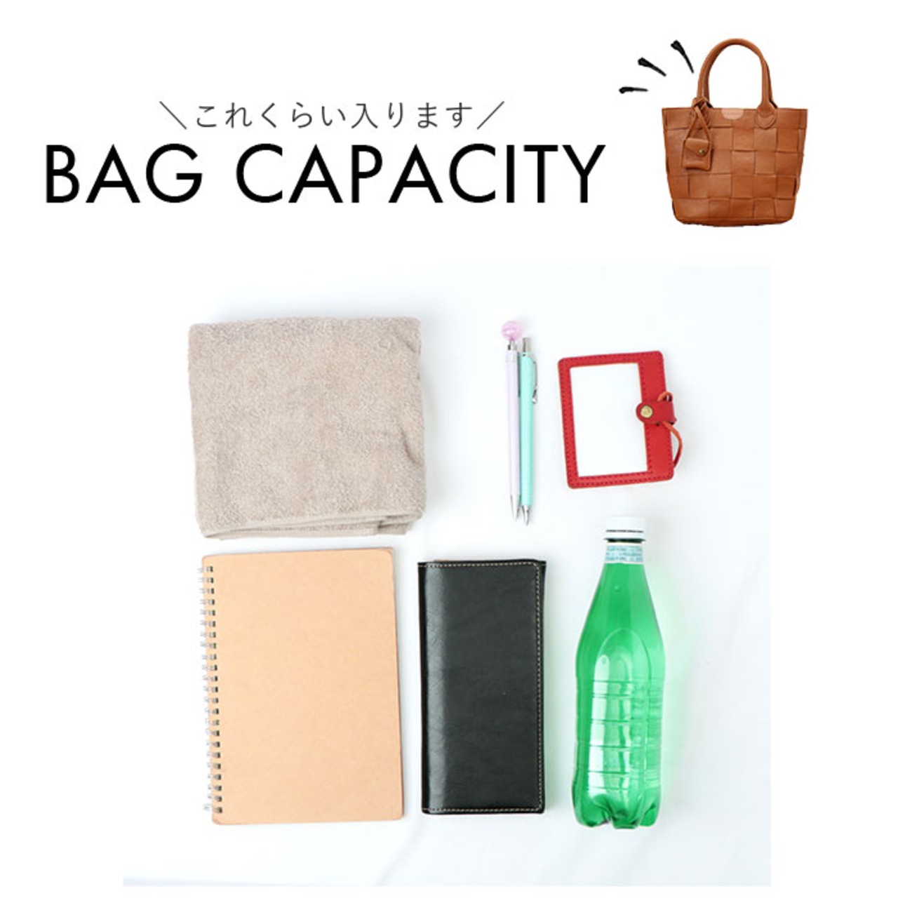 ・内側はA5サイズが横向きに、500mlペットボトルが縦向きにIN。程よくマチを設け、必需品がすっきりひとまとめ。