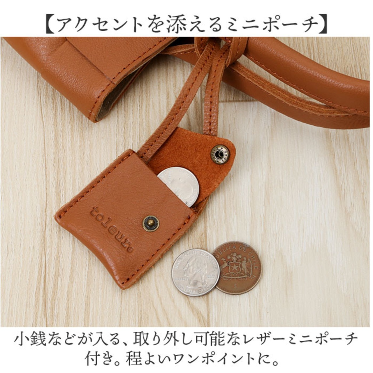 ・小銭などが入る、取り外し可能なレザーミニポーチ付き。程よいワンポイントに。