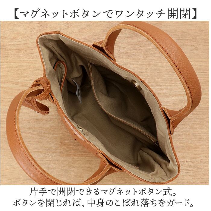 ・沢山の人にレザーを使ったバッグを持ってもらいたいという願いを込めて。レザーを使い、ナチュラル感と使いやすさを兼ね備えた仕上がり。