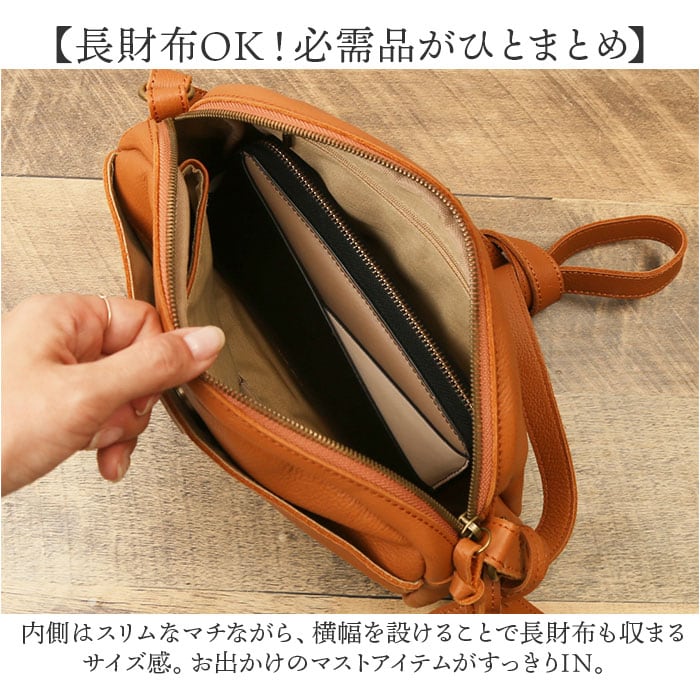 ・内側はスリムなマチながら、横幅を設けることで長財布も収まるサイズ感。お出かけのマストアイテムがすっきりIN。