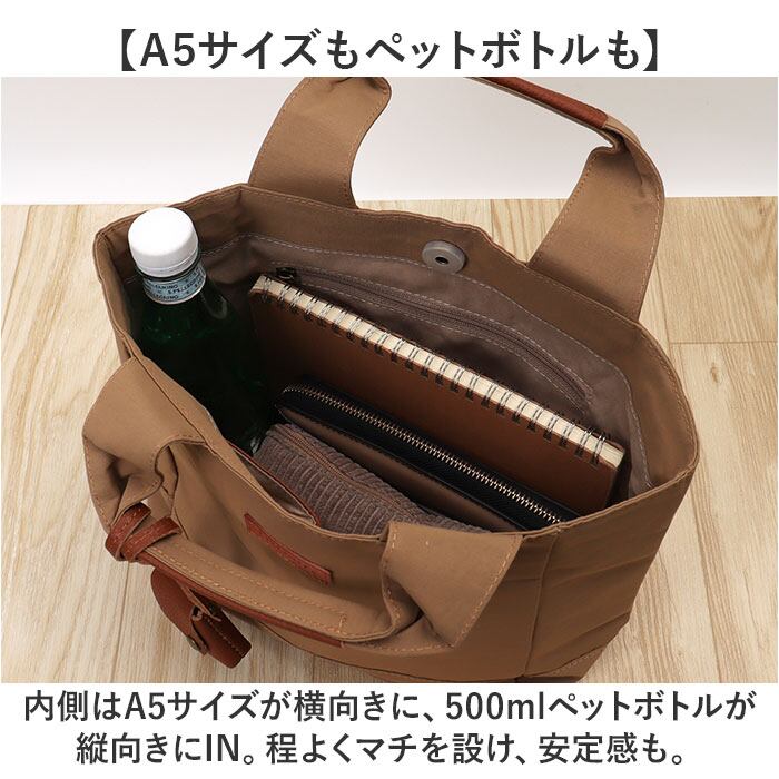 ・内側はA5サイズが横向きに、500mlペットボトルが縦向きにIN。程よくマチを設け、安定感も。