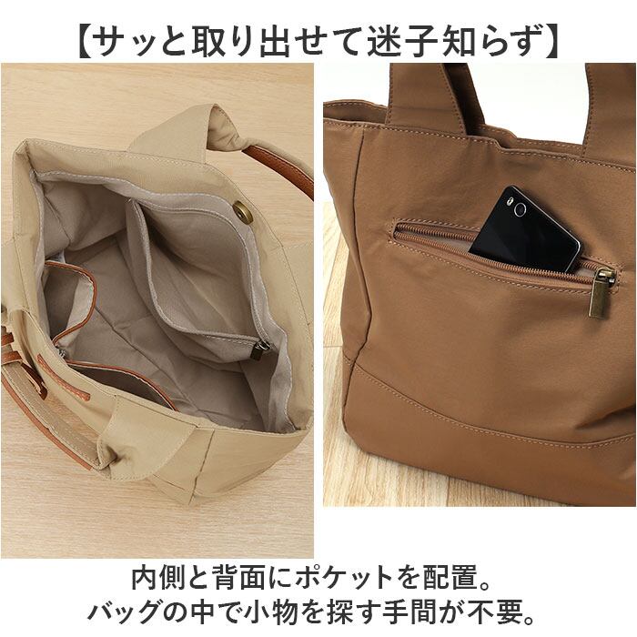 ・内側と背面にポケットを配置。バッグの中で小物を探す手間が不要。