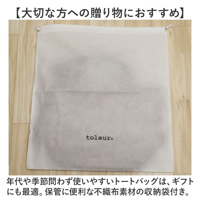 ・年代や季節問わず使いやすいトートバッグは、ギフトにも最適。保管に便利な不織布素材の収納袋付き。