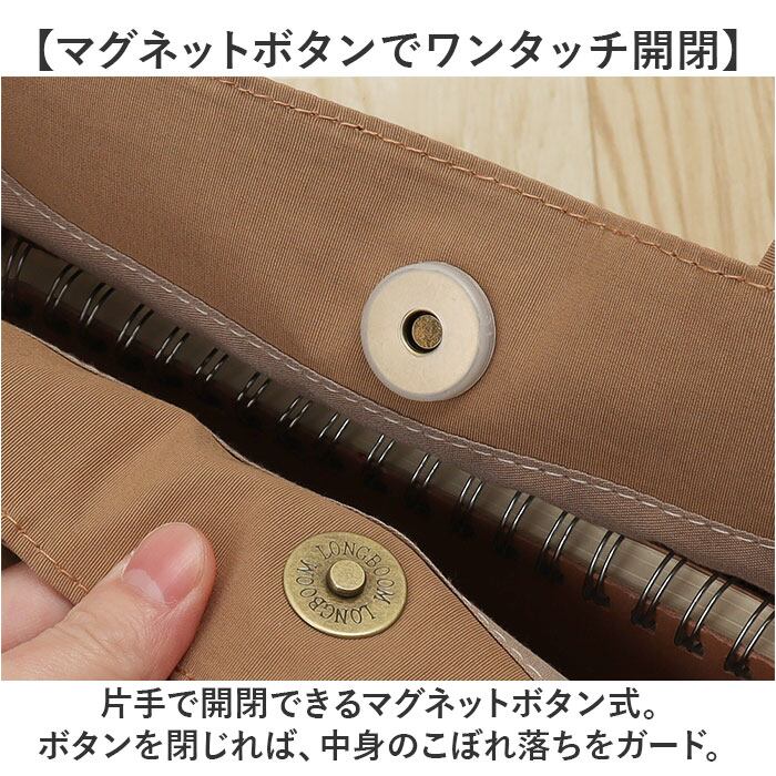 ・片手で開閉できるマグネットボタン式。ボタンを閉じれば、中身のこぼれ落ちをガード。