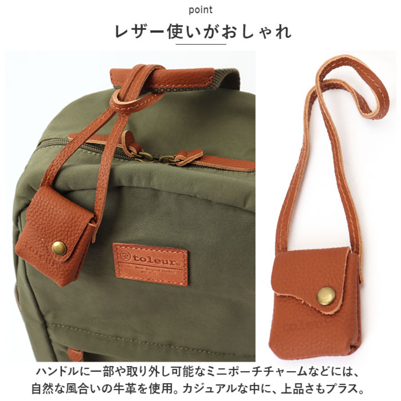 ・ハンドルに一部や取り外し可能なミニポーチチャームなどには、自然な風合いの牛革を使用。カジュアルな中に、上品さもプラス。