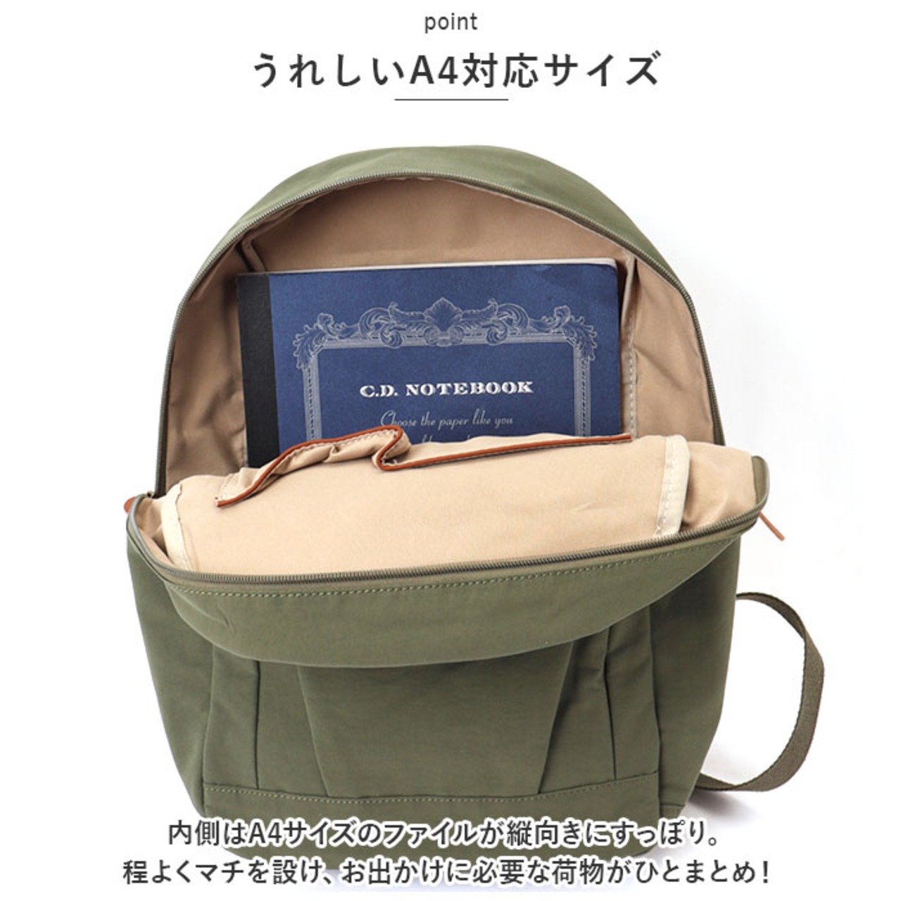 ・内側はA4サイズのファイルが縦向きにすっぽり。程よくマチを設け、お出かけに必要な荷物がひとまとめ!