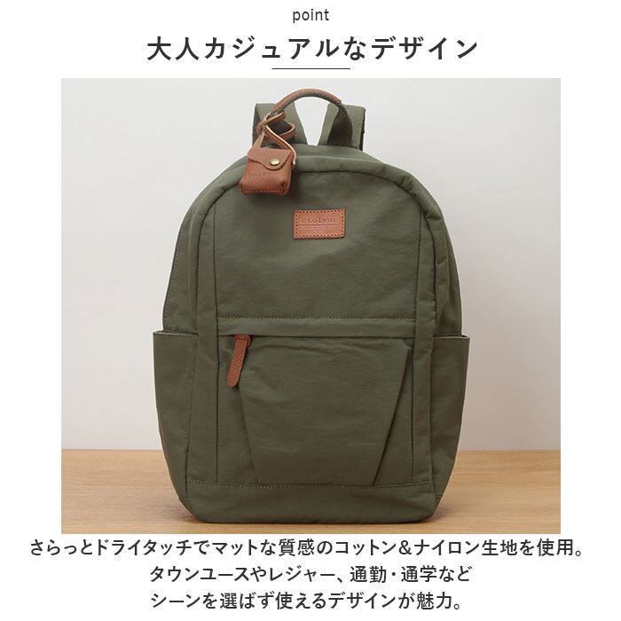 ・さらっとドライタッチでマットな質感のコットン&ナイロン生地を使用。タウンユースやレジャー、通勤・通学などシーンを選ばず使えるデザインが魅力。