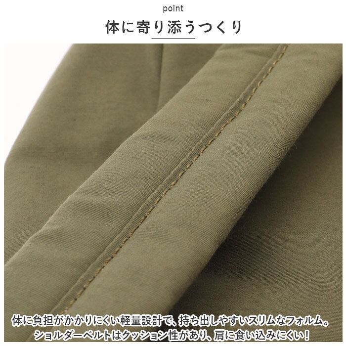 ・体に負担がかかりにくい軽量設計で、持ち出しやすいスリムなフォルム。ショルダーベルトはクッション性があり、肩に食い込みにくい!