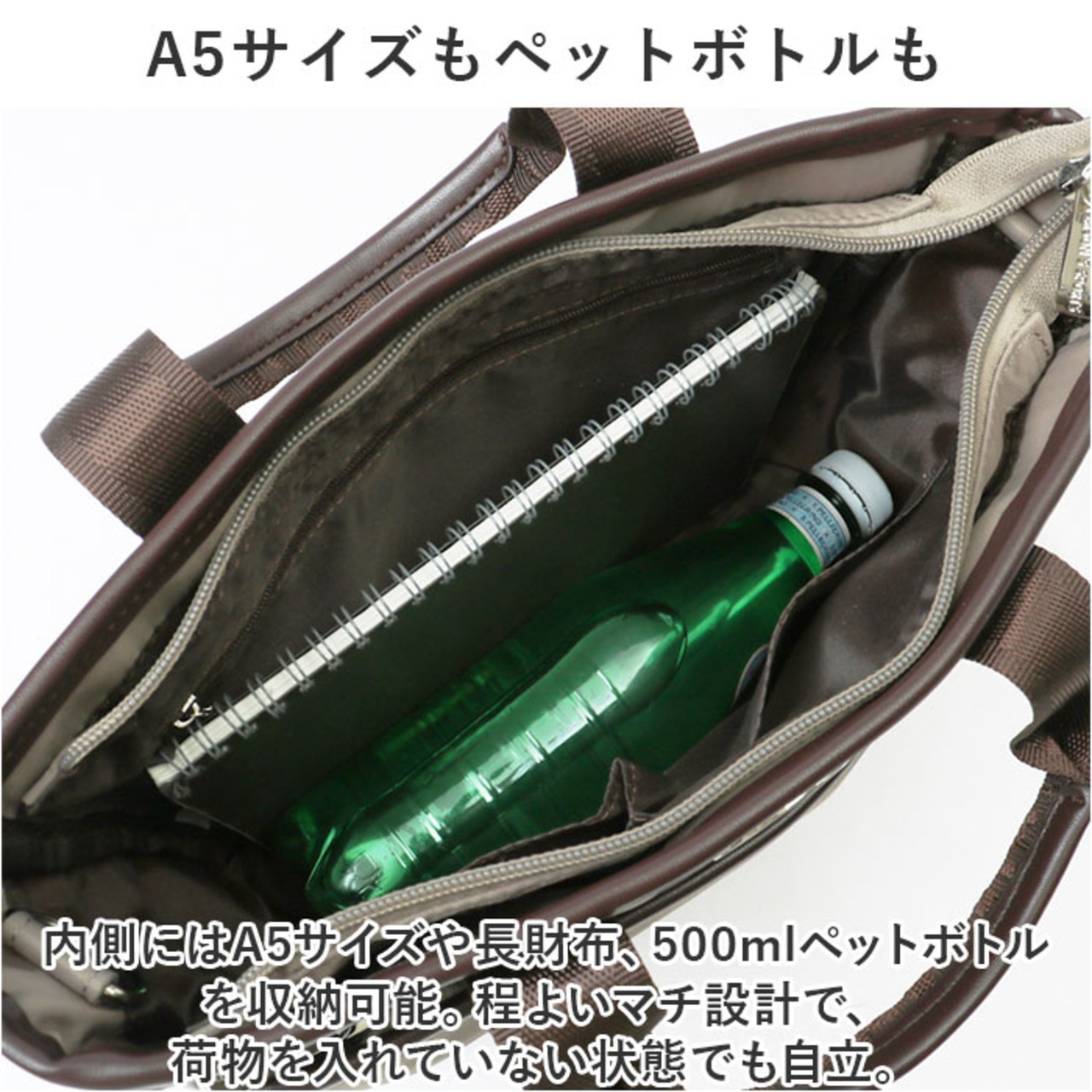 ・内側にはA5サイズや長財布、500mlペットボトルを収納可能。程よいマチ設計で、荷物を入れていない状態でも自立。