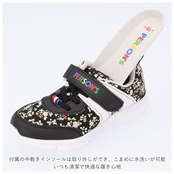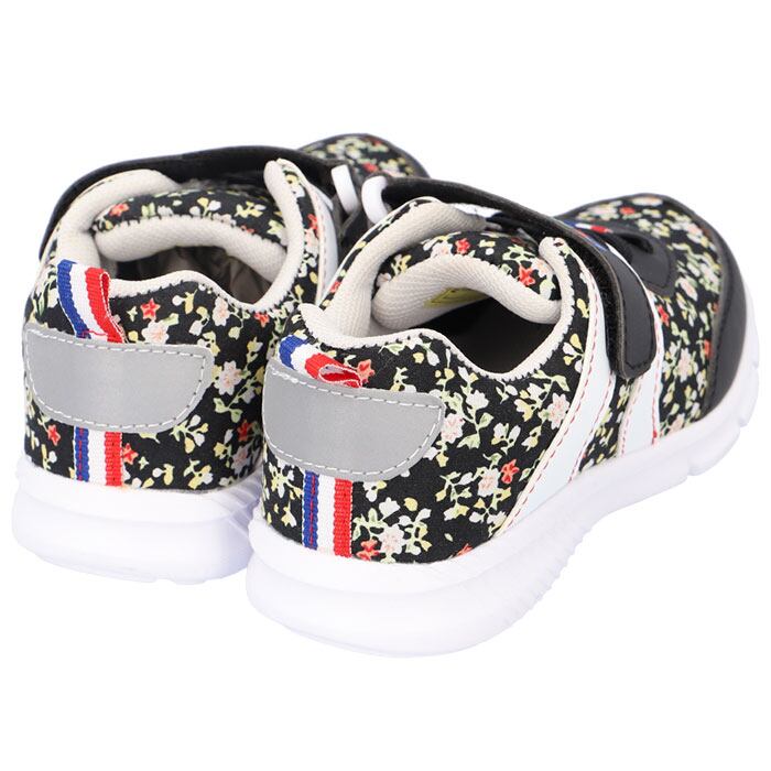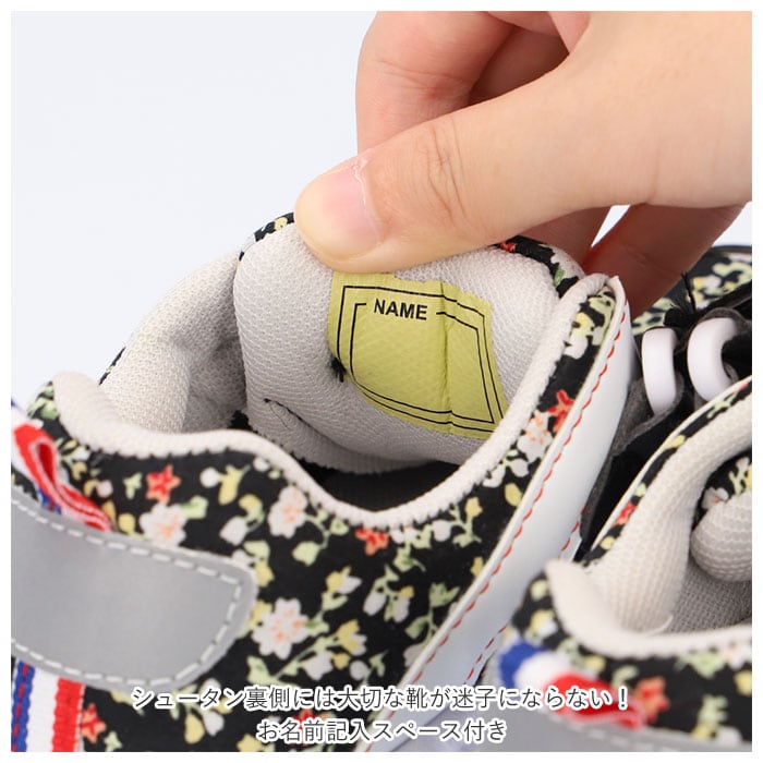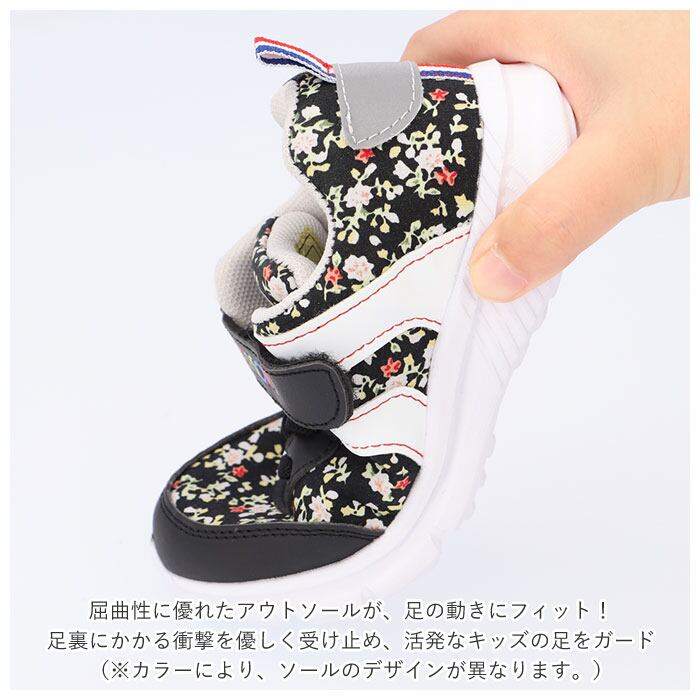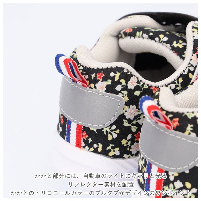 ・アッパーは、個性的な花柄の生地にフェイクレザーを組み合わせ、スポーティなデザインに繊細な女の子らしさをプラス!