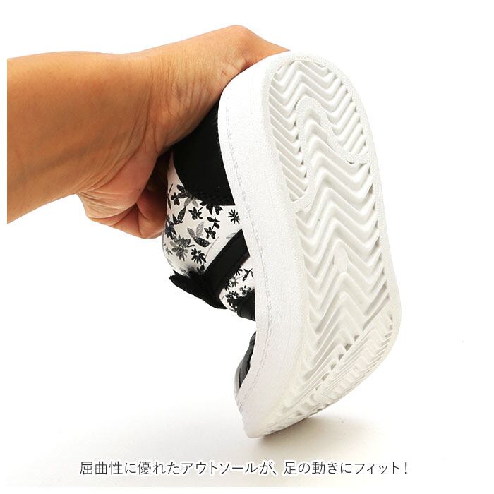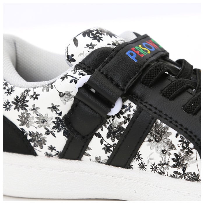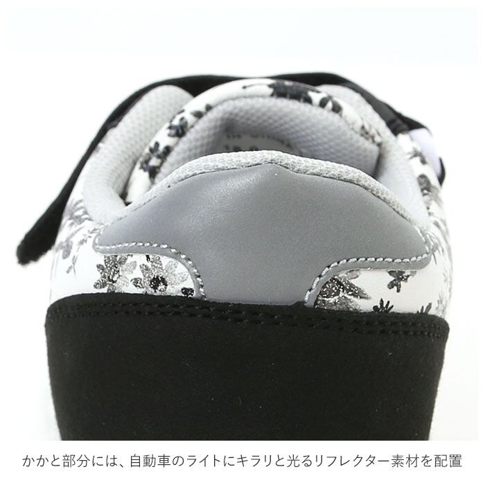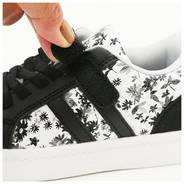 ・アッパーは、個性的な花柄の生地にフェイクレザーのラインを組み合わせ、スポーティなデザインに繊細な女の子らしさをプラス!