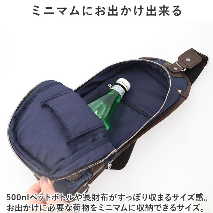 500nlペットボトルや長財布がすっぽり収まるサイズ感。お出かけに必要な荷物をミニマムに収納できるサイズ。