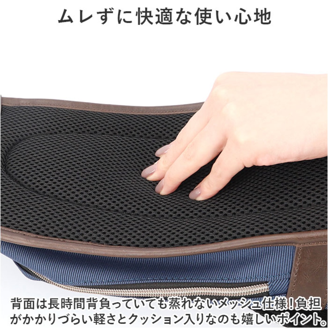 ・背面は長時間背負っていても蒸れないメッシュ仕様!負担がかかりづらい軽さとクッション入りなのも嬉しいポイント。