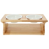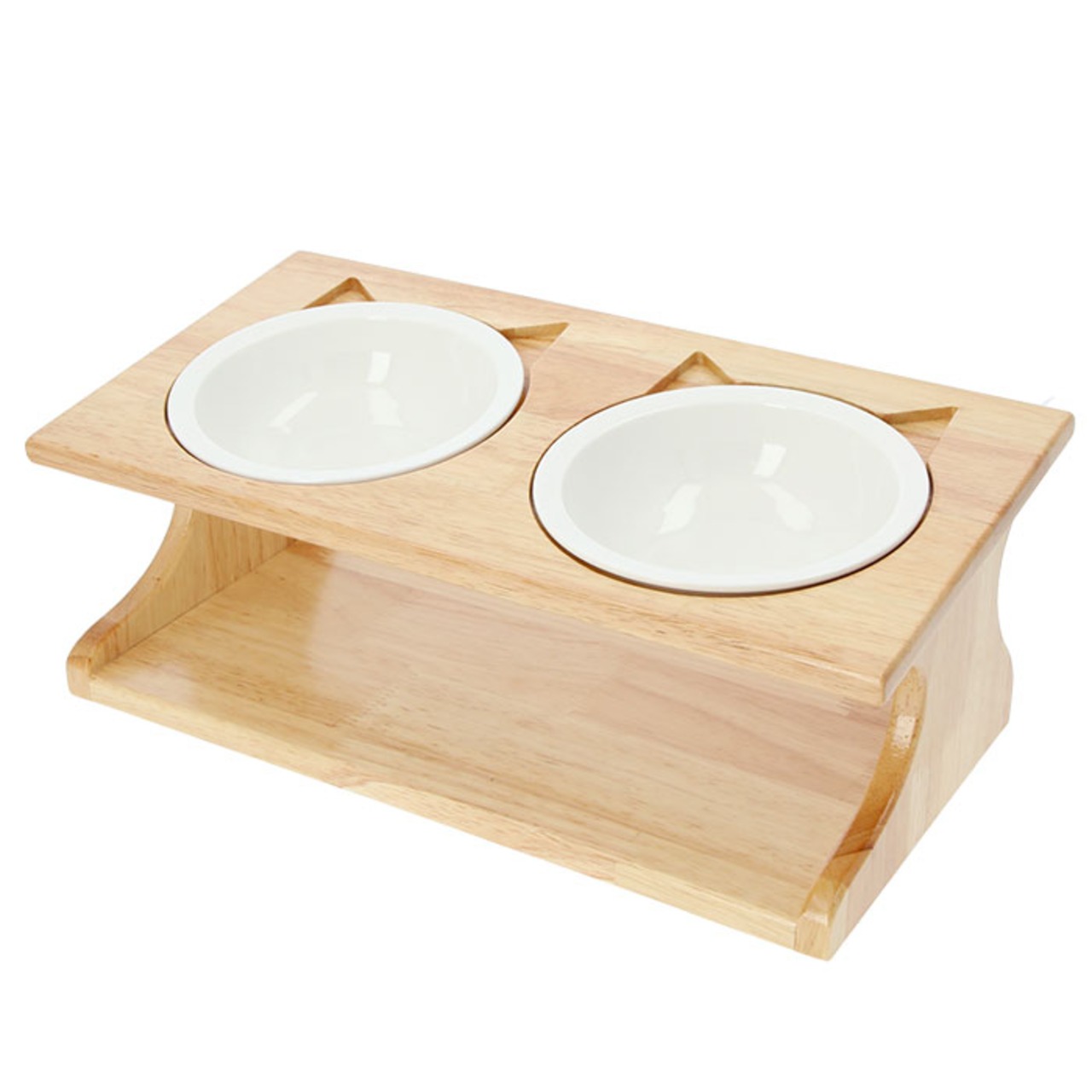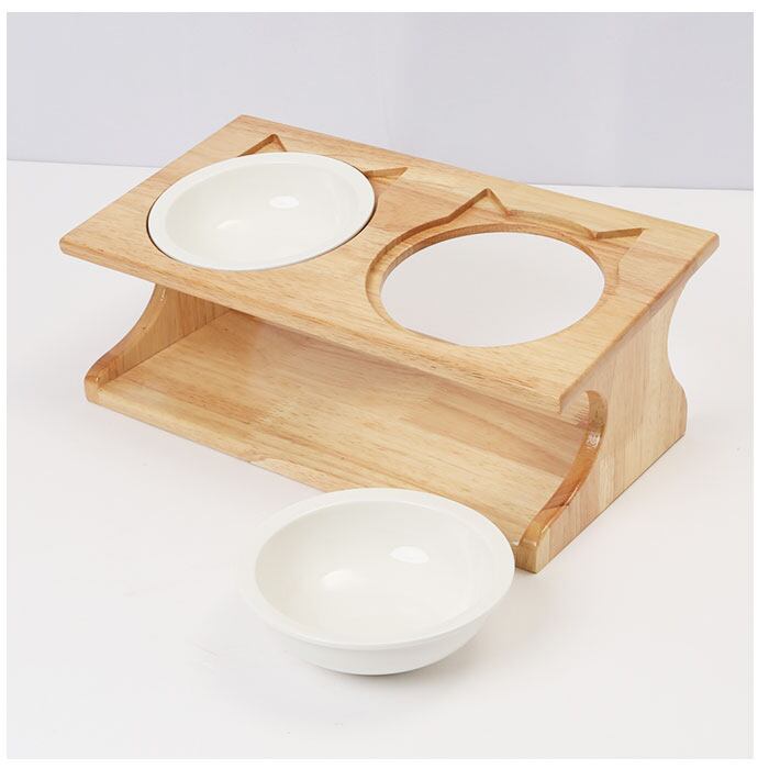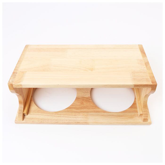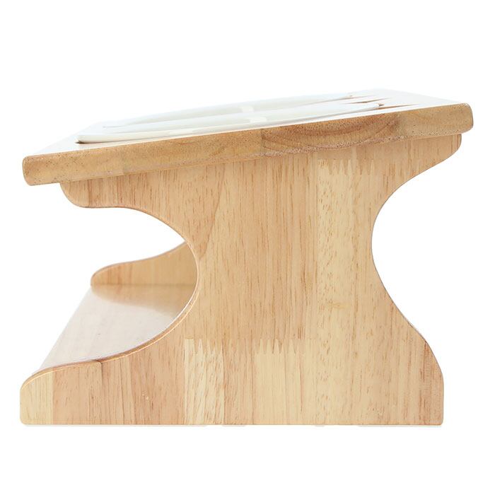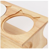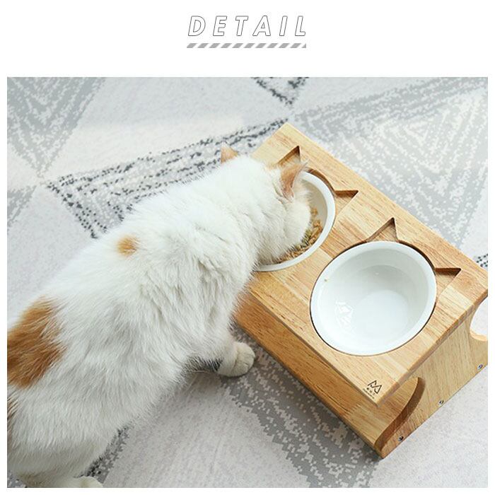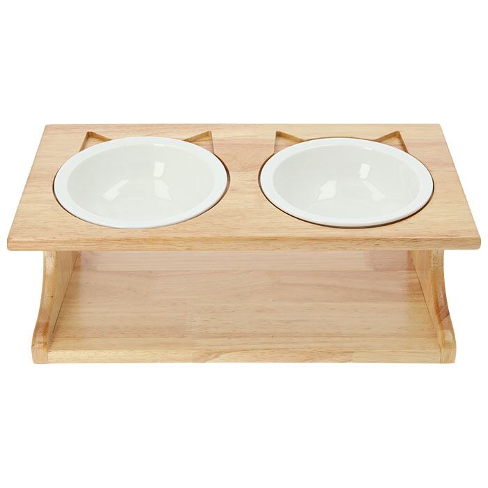 ・木目の風合いが優しい木製台座には、ウォーター用とフード用2つのボウルがセット可能。台座には15度の傾斜をつけて、ネコちゃんが大きく首を傾けなくても食べやすい角度にデザイン。