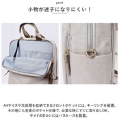 ・A4サイズや文具類を収納できるフロントポケットには、キーリングを装備。その他にも充実のポケット仕様で、必要な時にすぐに取り出しOK。サイドのDカンにはパスケースを装着。
