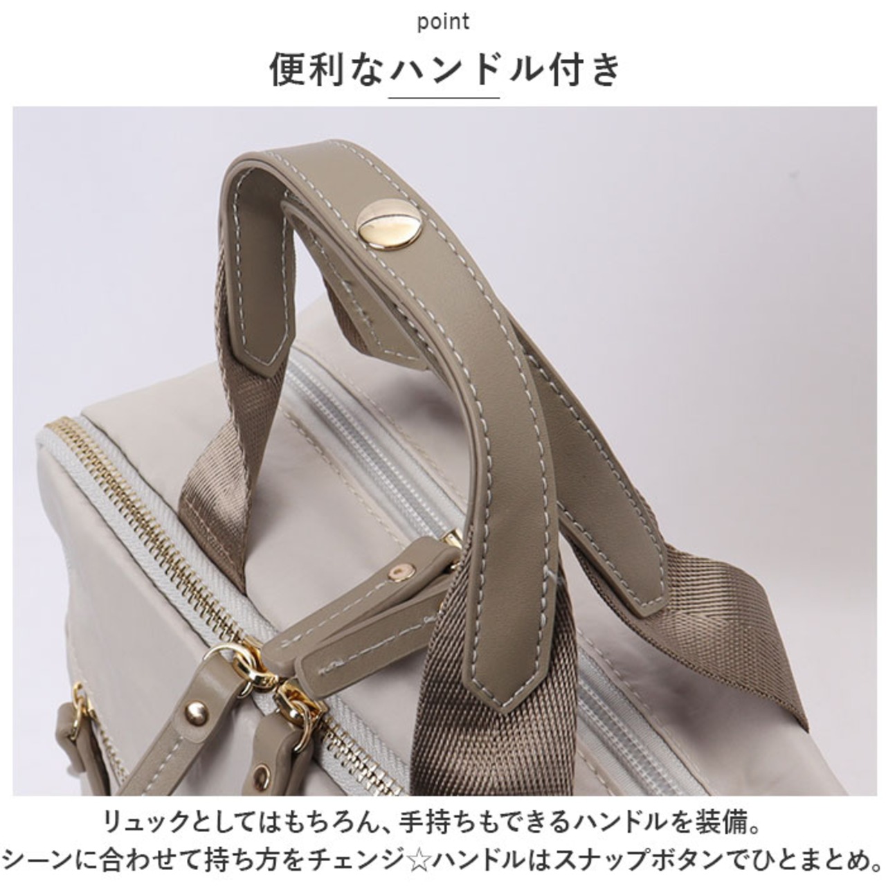 ・リュックとしてはもちろん、手持ちもできるハンドルを装備。シーンに合わせて持ち方をチェンジ☆ハンドルはスナップボタンでひとまとめ。