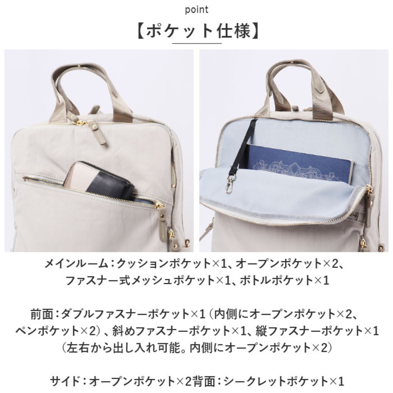 ※前面:ダブルファスナーポケット×1(内側にオープンポケット×2、ペンポケット×2)、斜めファスナーポケット×1、縦ファスナーポケット×1(左右から出し入れ可能。内側にオープンポケット×2)