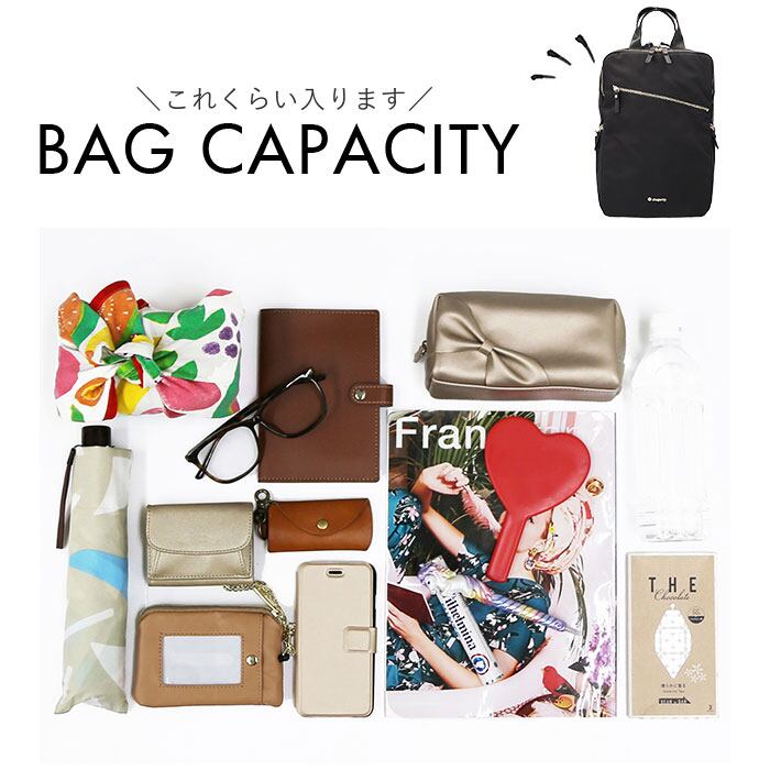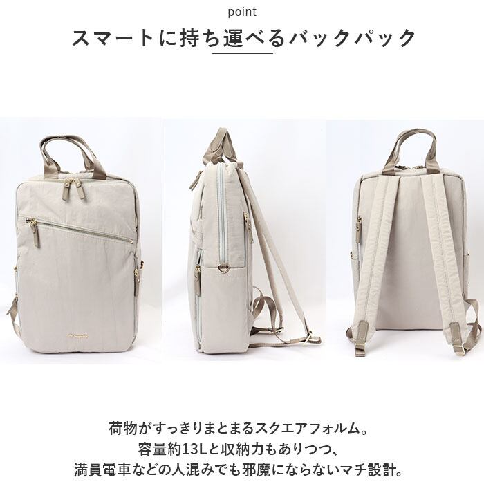 ・荷物がすっきりまとまるスクエアフォルム。容量約13Lと収納力もありつつ、満員電車などの人混みでも邪魔にならないマチ設計。
