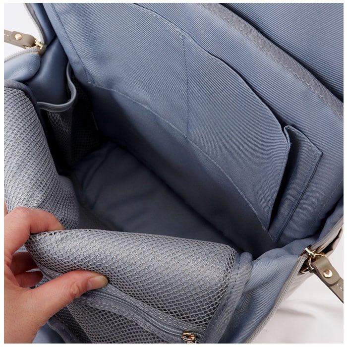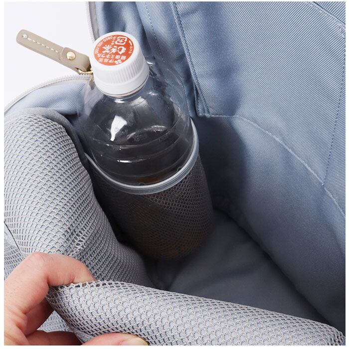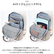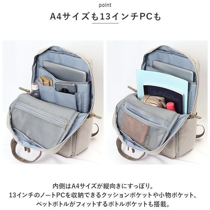 ・内側はA4サイズが縦向きにすっぽり。13インチのノートPCを収納できるクッションポケットや小物ポケット、ペットボトルがフィットするボトルポケットも搭載。