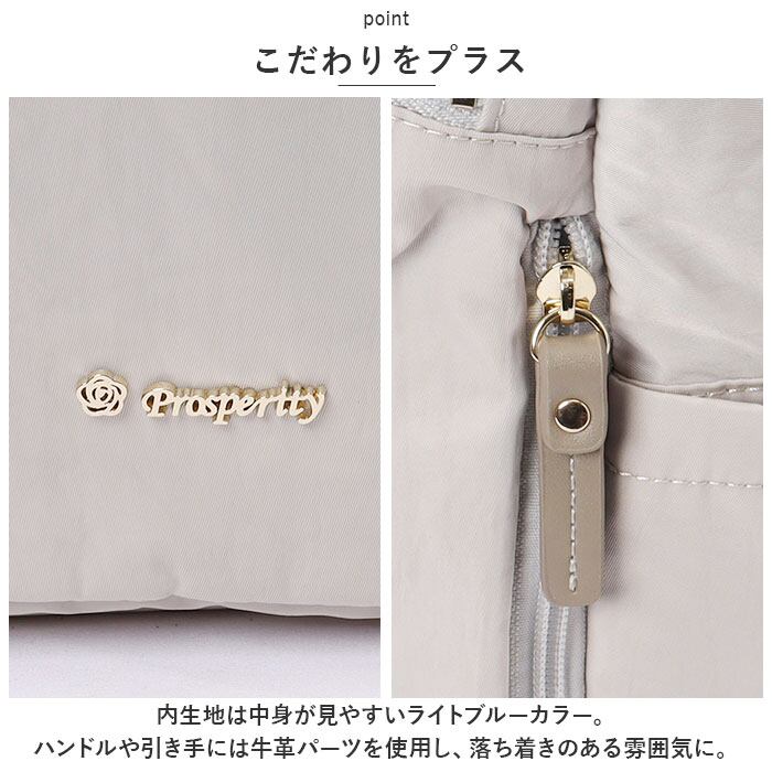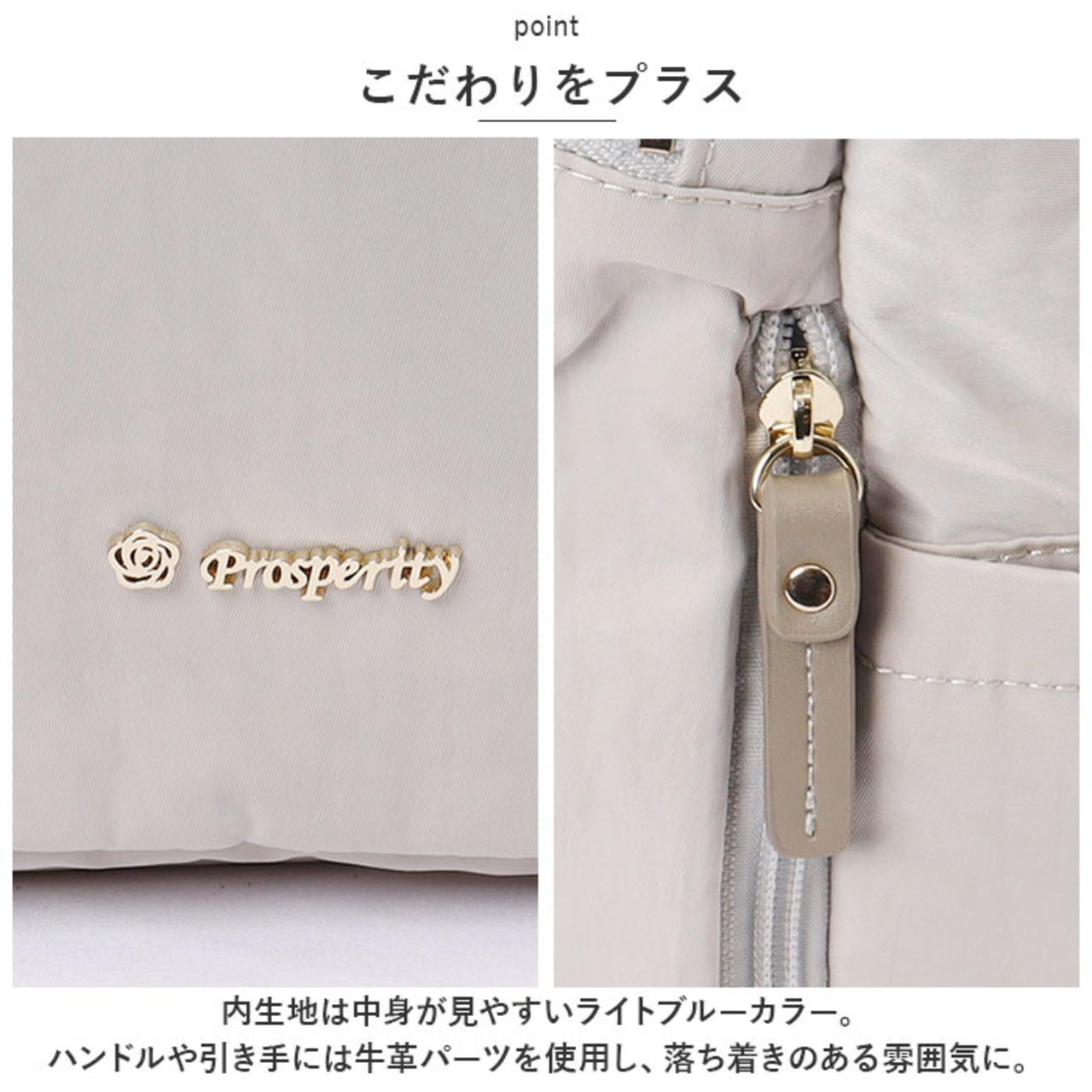 ・内生地は中身が見やすいライトブルーカラー。ハンドルや引き手には牛革パーツを使用し、落ち着きのある雰囲気に。