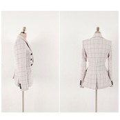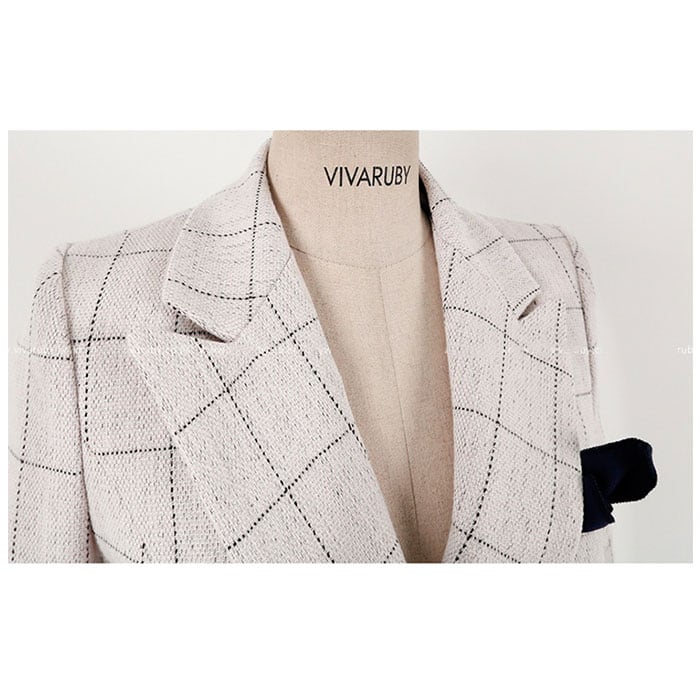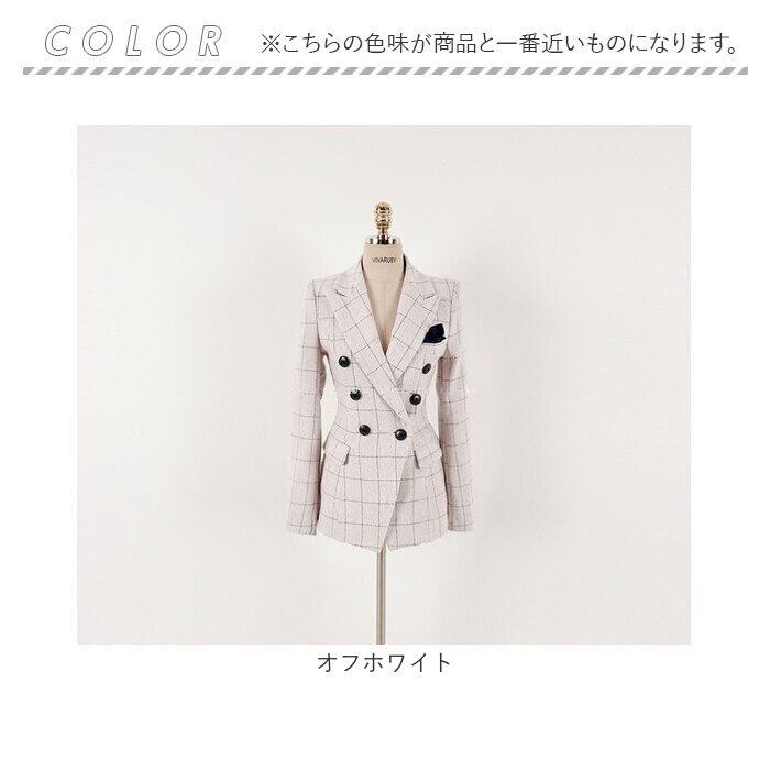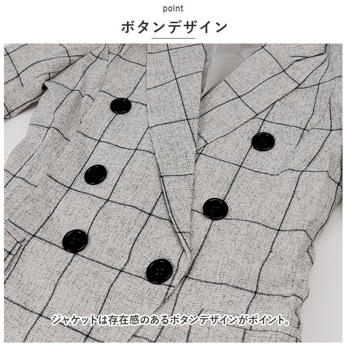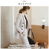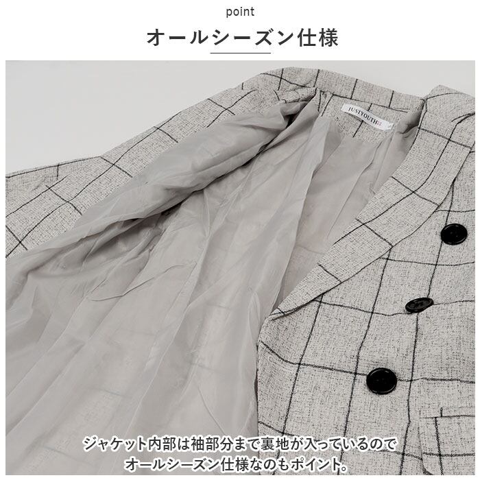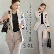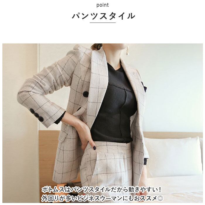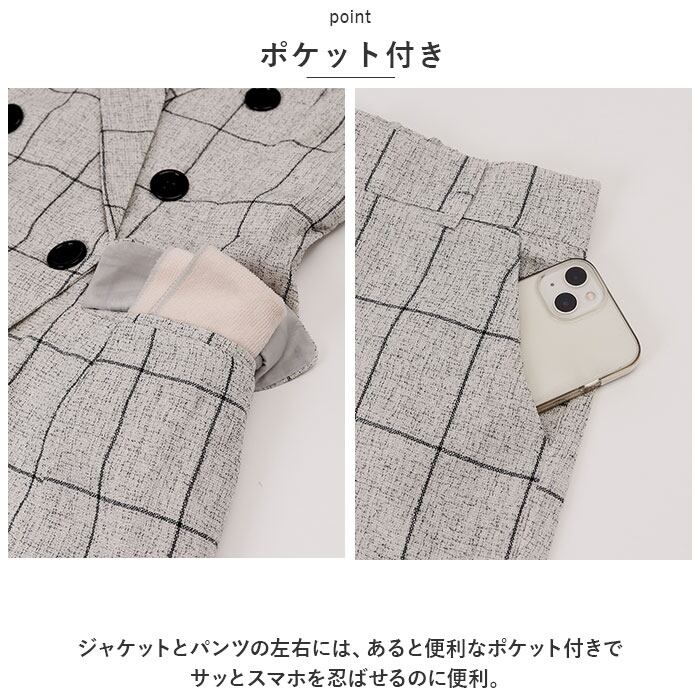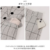 ・チェック柄のジャケットとパンツの上下セット。コーデに悩むことなく、おしゃれなスタイルが完成!