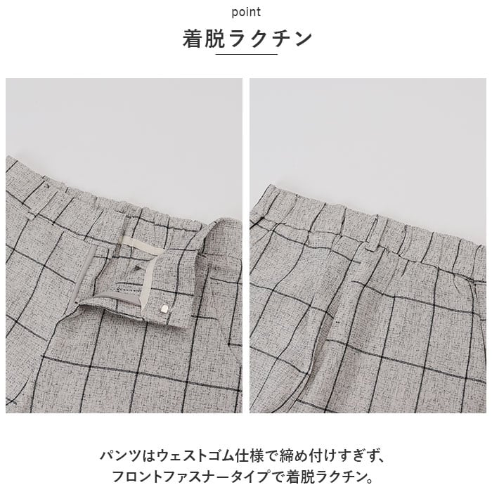 ・パンツはウェストゴム仕様で締め付けすぎず、フロントファスナータイプで着脱ラクチン。