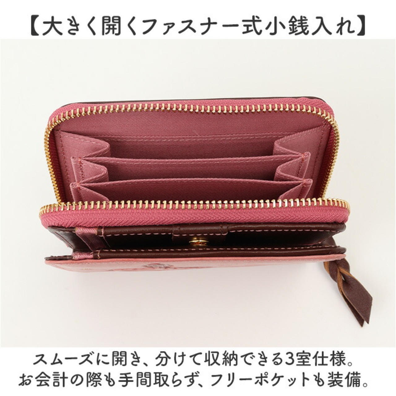 ・スムーズに開き、分けて収納できる3室仕様。お会計の際も手間取らず、フリーポケットも装備。