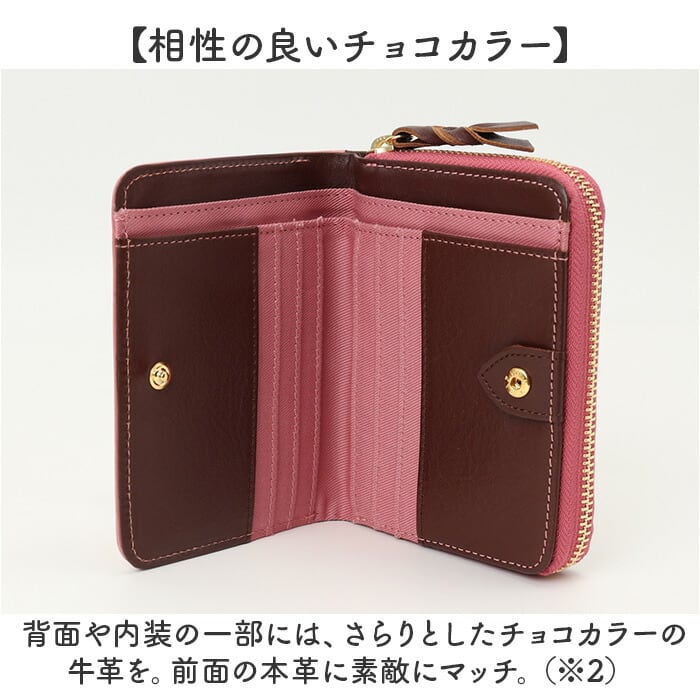 ・背面や内装の一部には、さらりとしたチョコカラーの牛革を。前面の本革に素敵にマッチ。
