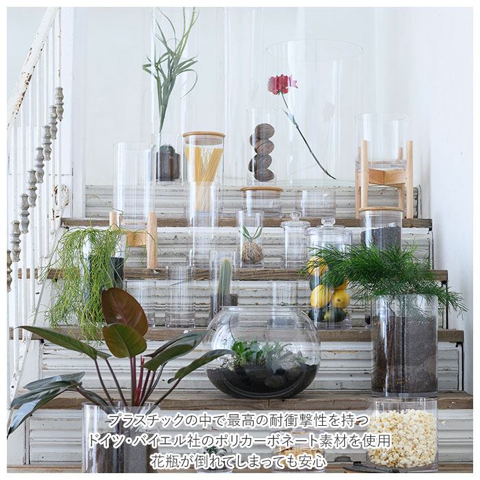 ・プラスチックの中で最高の耐衝撃性を持つドイツ・バイエル社のポリカーボネート素材を使用。美しさと耐久性を兼ね備えた、シンプルなシリンダー型のフラワーベース。