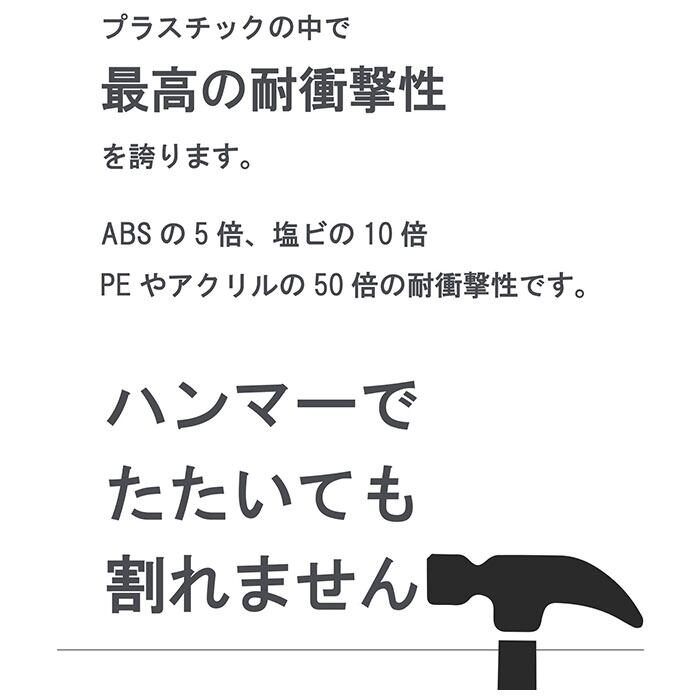 ・ABS樹脂の5倍、ポリ塩化ビニルの10倍、PEやアクリルの50倍。ハンマーで叩いても壊れないほどの耐衝撃性を誇り、花瓶が倒れてしまっても安心。