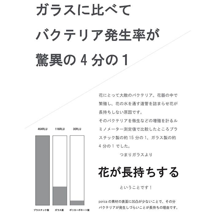 ・花器内部のバクテリア繁殖率はガラスの約1/4以下のため、お花のみずみずしさが長持ち。