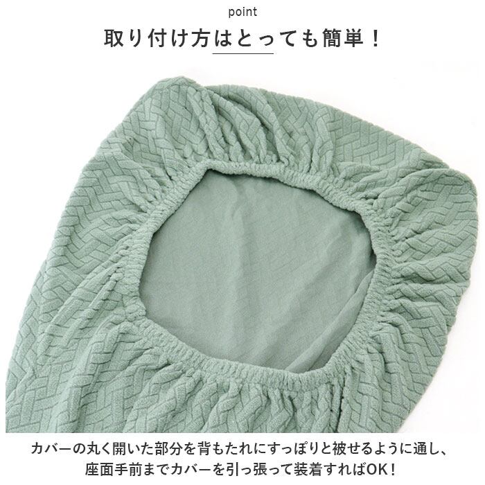 ・カバーの丸く開いた部分を背もたれにすっぽりと被せるように通し、座面手前までカバーを引っ張って装着すればOK!