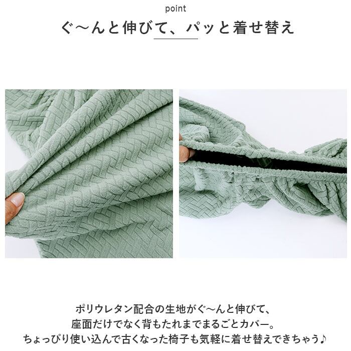 ・ポリウレタン配合の生地がぐ~んと伸びて、座面だけでなく背もたれまでまるごとカバー。ちょっぴり使い込んで古くなった椅子も気軽に着せ替えできちゃう♪