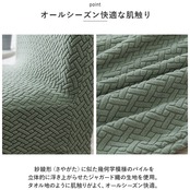 ・紗綾形(さやがた)に似た幾何学模様のパイルを立体的に浮き上がらせたジャガード織の生地を使用。タオル地のように肌触りがよく、オールシーズン快適。
