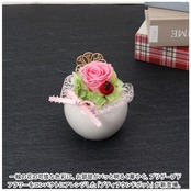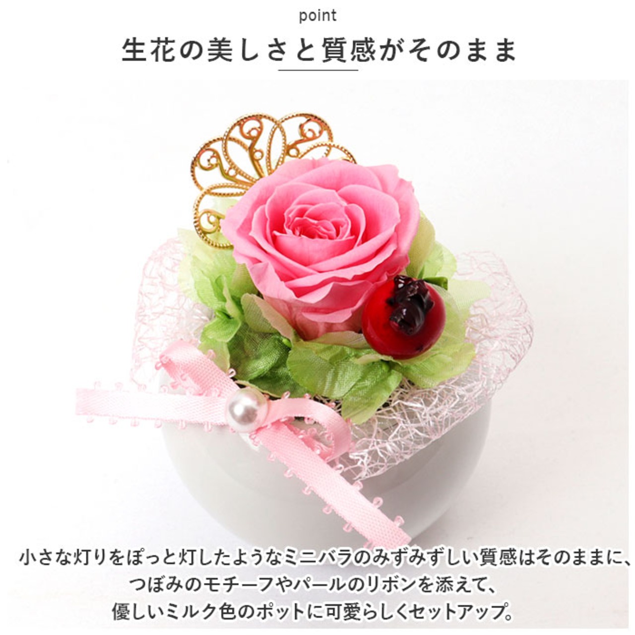 ・小さな灯りをぽっと灯したようなミニバラのみずみずしい質感はそのままに、つぼみのモチーフやパールのリボンを添えて、優しいミルク色のポットに可愛らしくセットアップ。