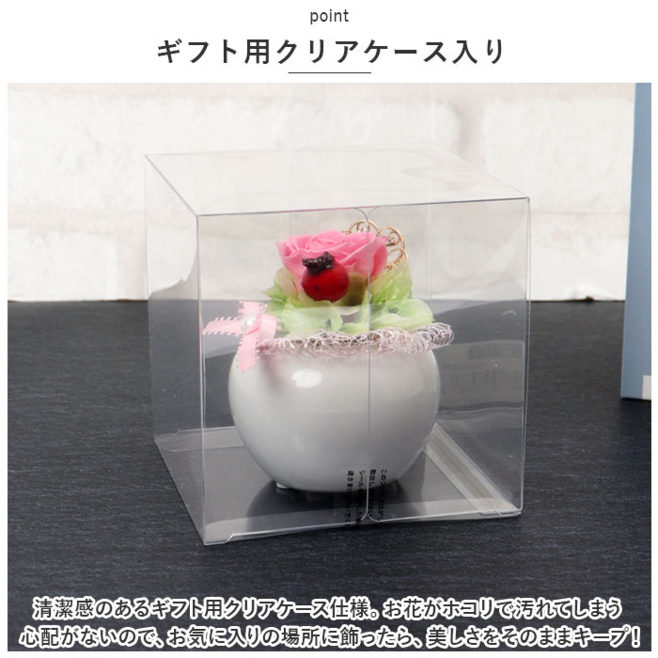 ・清潔感のあるギフト用クリアケース仕様。お花がホコリで汚れてしまう心配がないので、お気に入りの場所に飾ったら、美しさをそのままキープ!