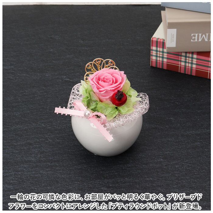 ・一輪の花の可憐な色彩に、お部屋がパッと明るく華やぐ。プリザーブドフラワーをコンパクトにアレンジした「プティラウンドポット」が新登場。