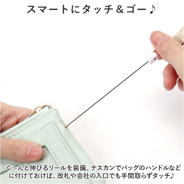 ・ぐ~んと伸びるリールを装備。ナスカンでバッグのハンドルなどに付けておけば、改札や会社の入口でも手間取らずタッチ♪