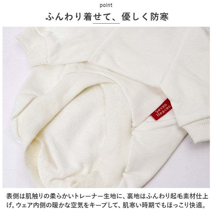 ・表側は肌触りの柔らかいトレーナー生地に、裏地はふんわり起毛素材仕上げ。ウェア内側の暖かな空気をキープして、肌寒い時期でもほっこり快適。