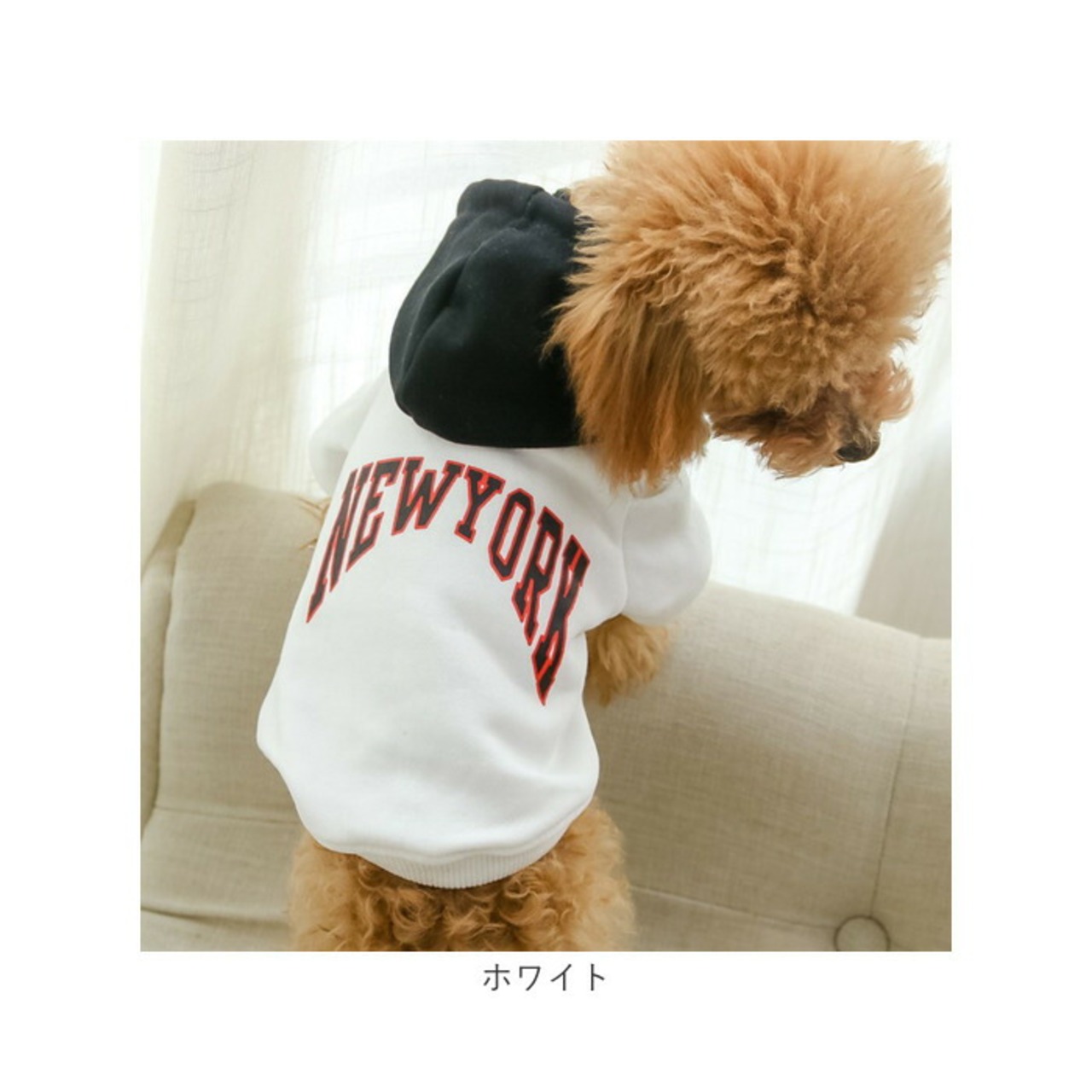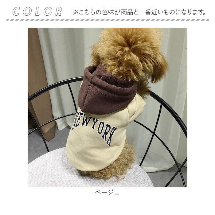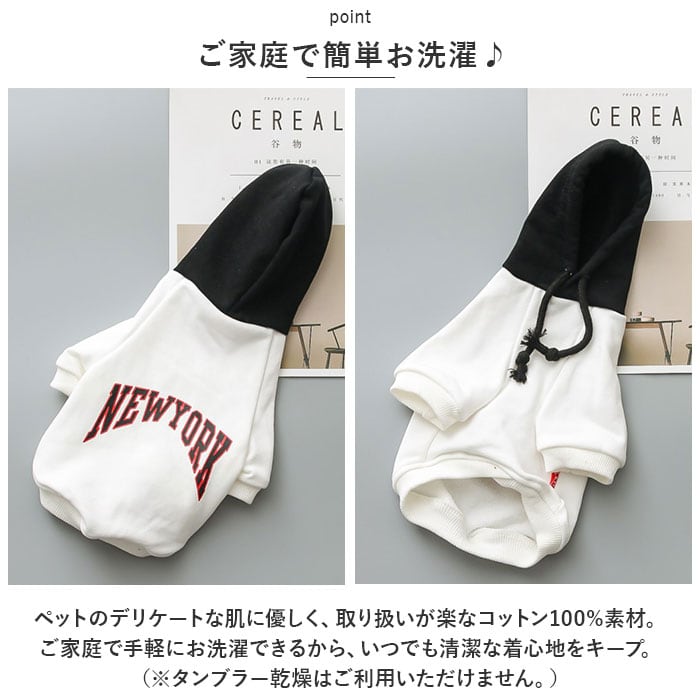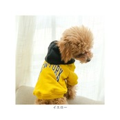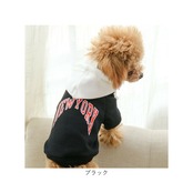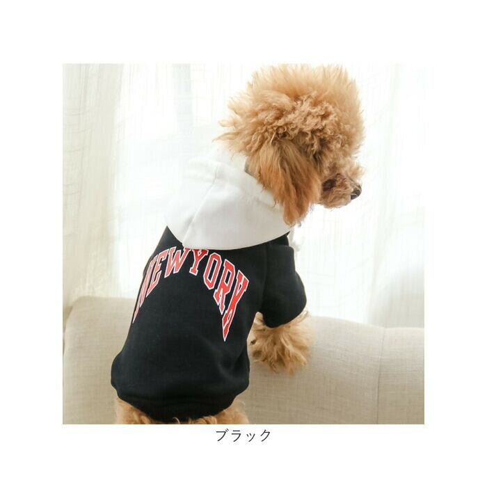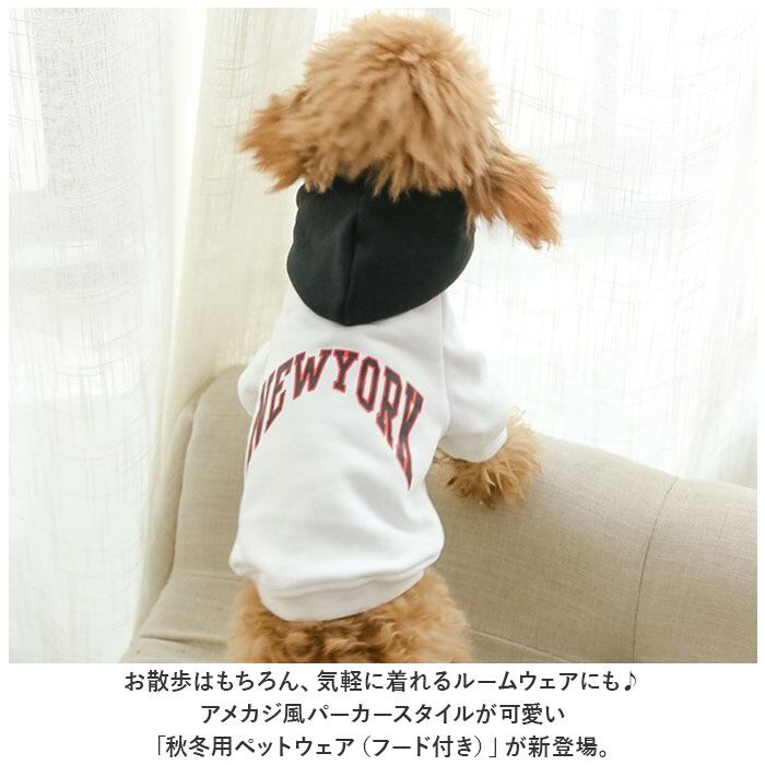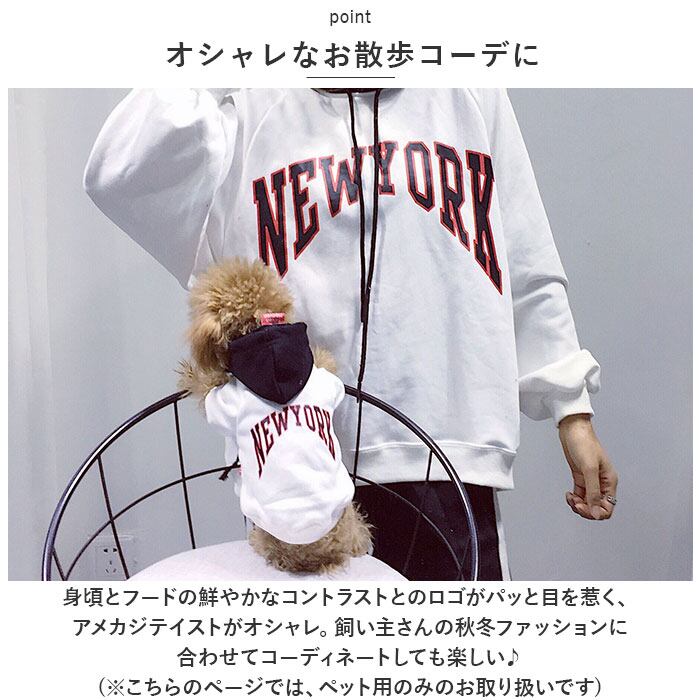 ・身頃とフードの鮮やかなコントラストと「NEW YORK」のロゴがパッと目を惹く、アメカジテイストがオシャレ。飼い主さんの秋冬ファッションに合わせてコーディネートしても楽しい♪