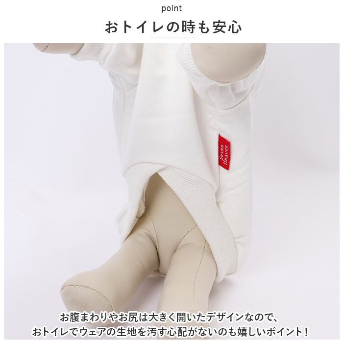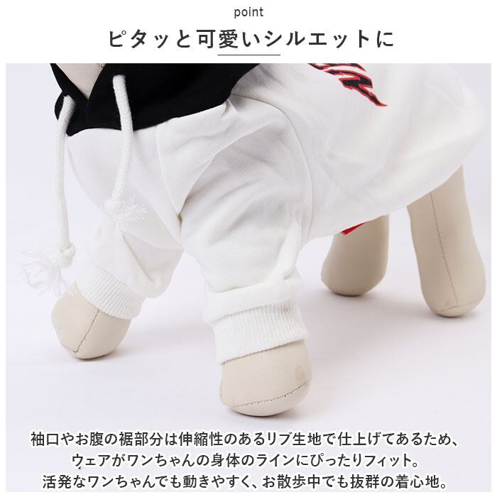 ・袖口やお腹の裾部分は伸縮性のあるリブ生地で仕上げてあるため、ウェアがワンちゃんの身体のラインにぴったりフィット。活発なワンちゃんでも動きやすく、お散歩中でも抜群の着心地。