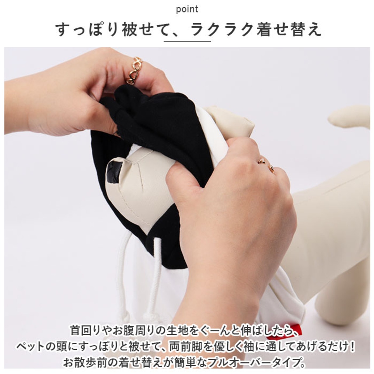 ・首回りやお腹周りの生地をぐーんと伸ばしたら、ペットの頭にすっぽりと被せて、両前脚を優しく袖に通してあげるだけ!お散歩前の着せ替えが簡単なプルオーバータイプ。