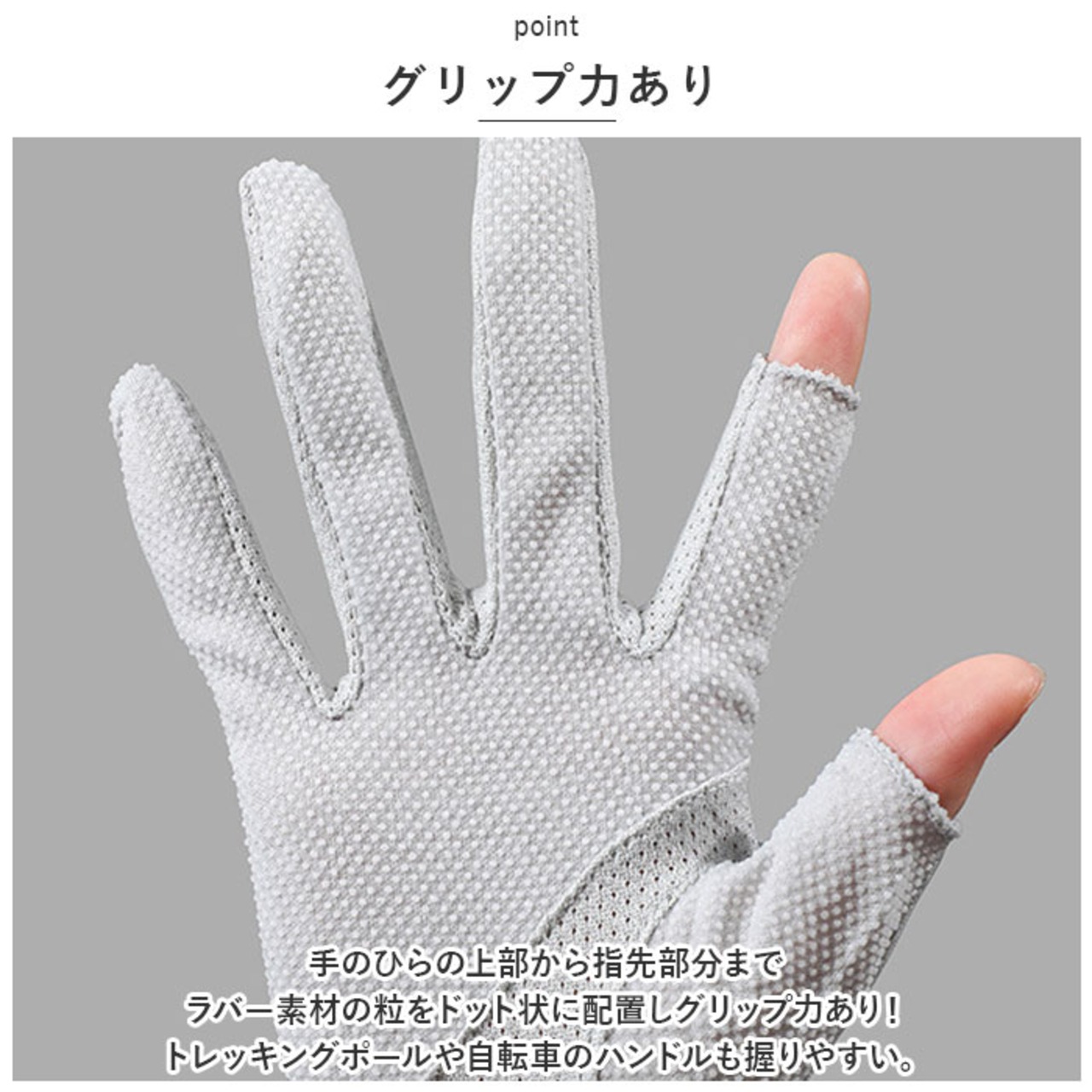 ・手のひらの上部から指先部分までラバー素材の粒をドット状に配置しグリップ力あり!トレッキングポールや自転車のハンドルも握りやすい。