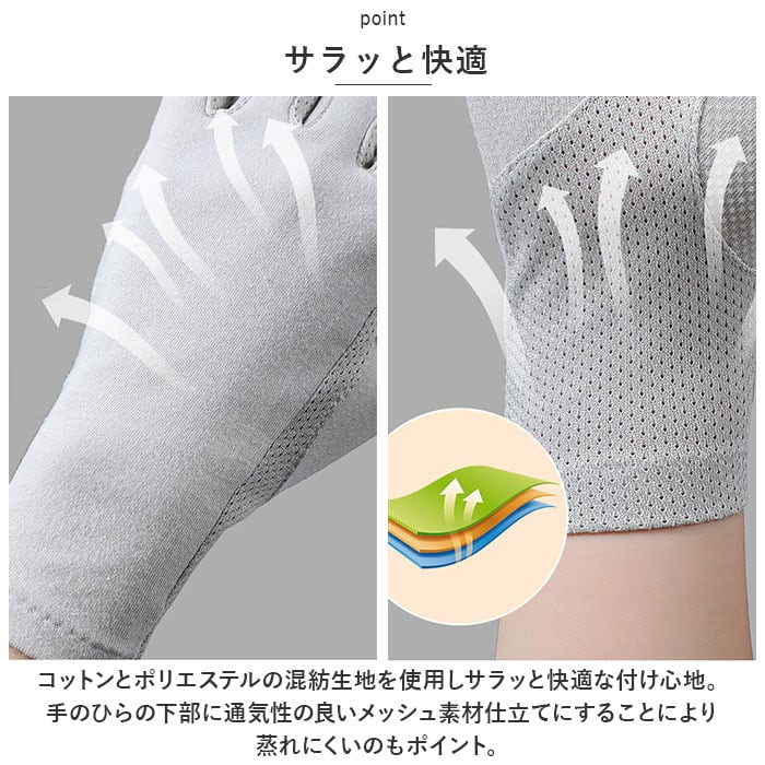 ・手のひらの下部に通気性の良いメッシュ素材仕立てにすることにより蒸れにくいのもポイント。