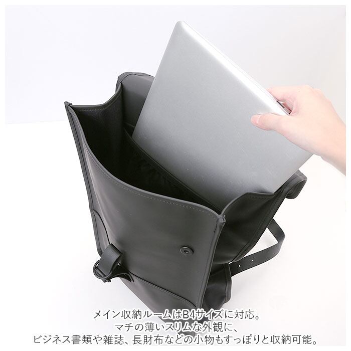 ・メイン収納ルームはB4サイズに対応。マチの薄いスリムな外観に、ビジネス書類や雑誌、長財布などの小物もすっぽりと収納可能。