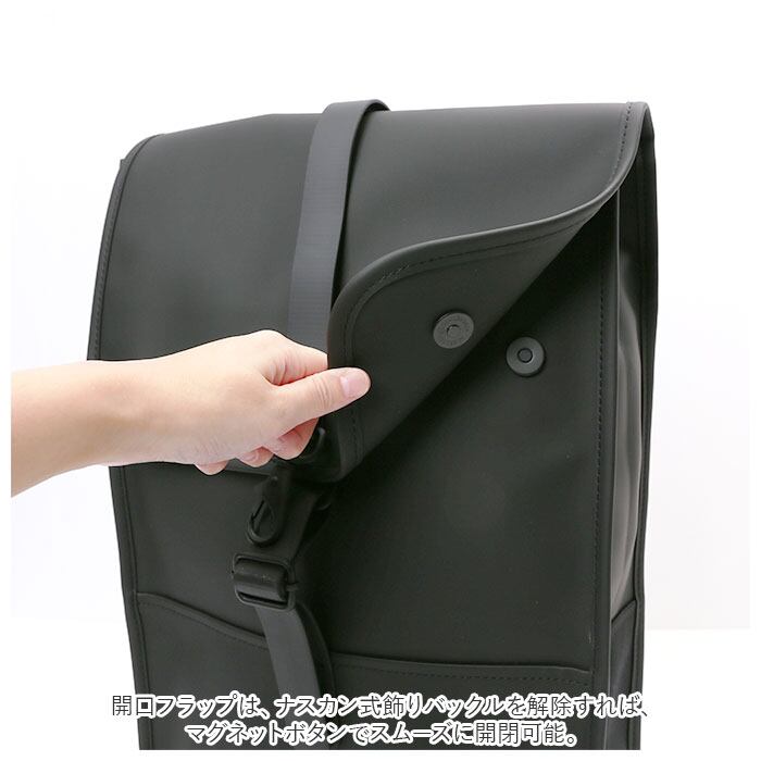 ・開口フラップは、ナスカン式飾りバックルを解除すれば、マグネットボタンでスムーズに開閉可能。