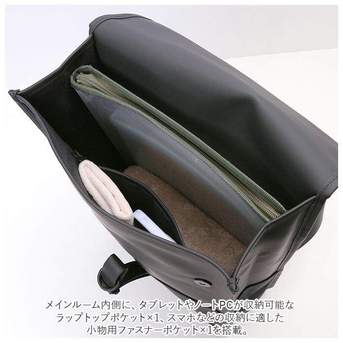 ・メインルーム内側に、タブレットやノートPCが収納可能なラップトップポケット×1、スマホなどの収納に適した小物用ファスナーポケット×1を搭載。