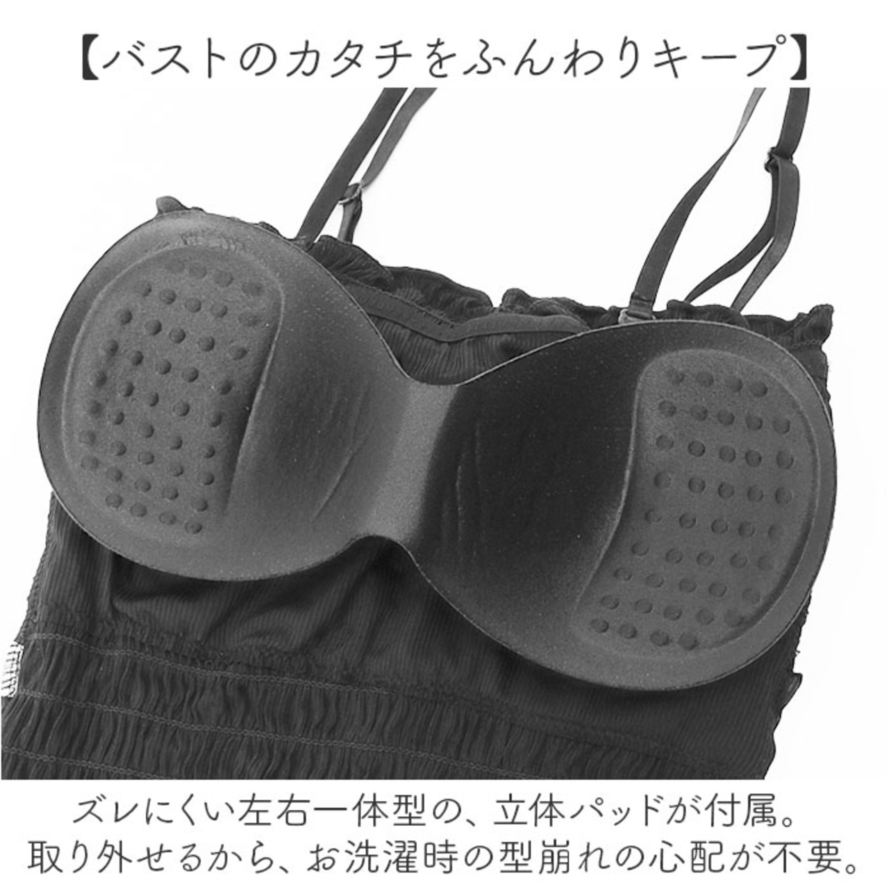 ・ズレにくい左右一体型の、立体パッドが付属。取り外せるから、お洗濯時の型崩れの心配が不要。